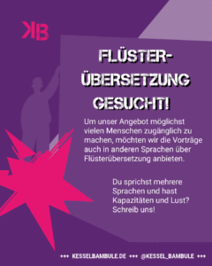 Du hast Lust, die Workshopbeiträge der Mobilität für Alle – Konferenz auch Menschen zugänglich zu machen, die kein Deutsch sprechen? Dann freuen wir uns, wenn du bei der Flüsterübersetzung hilfst! Bei Flüsterübersetzungen setzen sich die Menschen, für die gedolmetscht wird, mit der dolmetschenden Person zusammen, sodass leise und simultan übersetzt werden kann. Wir würden gerne so viele Beiträge wie möglich auf englisch und französisch mitbewerben – und falls du eine weitere Sprache sprichst und in diese dolmetschen möchtest, gerne auch in diese Sprache! Zu Beginn jedes Programmbeitrags werden wir fragen, ob sich Menschen Übersetzungen wünschen und dann entsprechende Übersetzungsecken im Raum einrichten. Um abschätzen zu können, für welche Programmpunkte eine Übersetzung möglich sein wird, welche wir also mehrsprachig bewerben können, gib uns gerne so bald wie möglich per DM oder Mail Bescheid, welche(n) Beitrag/Beiträge du in welche Sprache(n) übersetzen würdest. Vielen Dank!